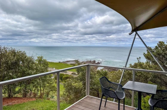 Set within the peaceful surrounds of Queens Park, the tent provides a private retreat with panoramic views across Loutit Bay. You can enjoy wine and cheese on the balcony while taking in the ocean views or relax in the comfort of a queen bed after a day exploring the coast.